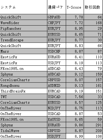 この週はKoToRiが始めてトレードした週です。なのでストラテジーの選び方とか超適当ですが、どうやらT-SCOREベースで選択するのが良いらしくそれを踏まえなんとなくで選びました。